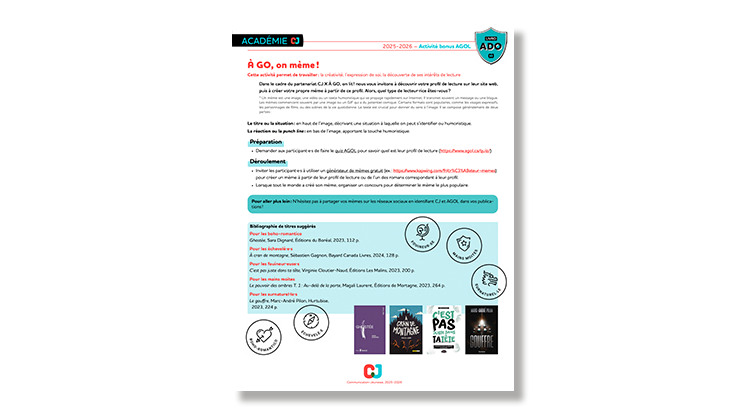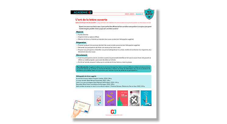 Quand une cause nous tient à cœur, il faut savoir la défendre ! Avec cette activité, les jeunes sont invités à rédiger une lettre ouverte sur un sujet qui les passionne ou les indigne. En s’inspirant de lectures engagées, iels apprennent à structurer leurs arguments, à trouver les mots justes et à exprimer leur opinion avec conviction.